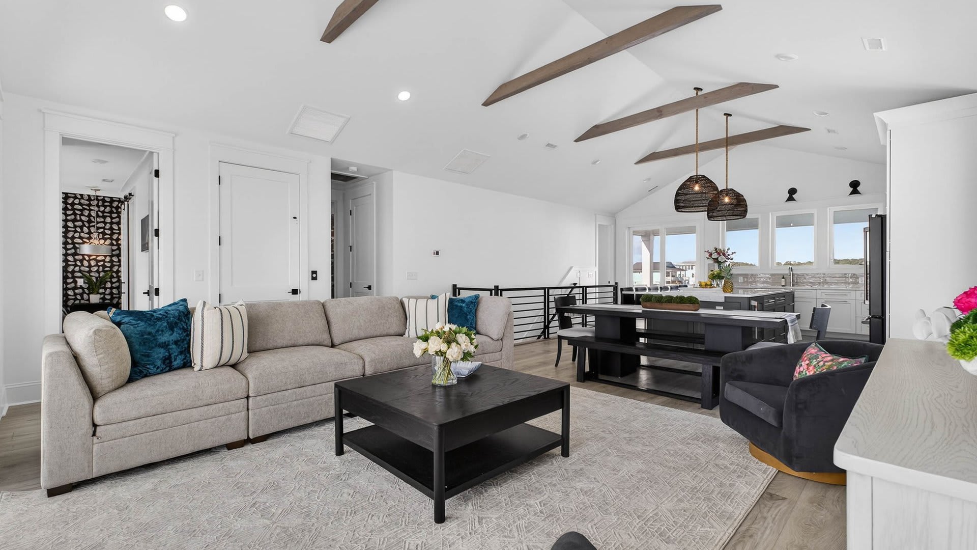 Bright open-concept kitchen, dining, and living area