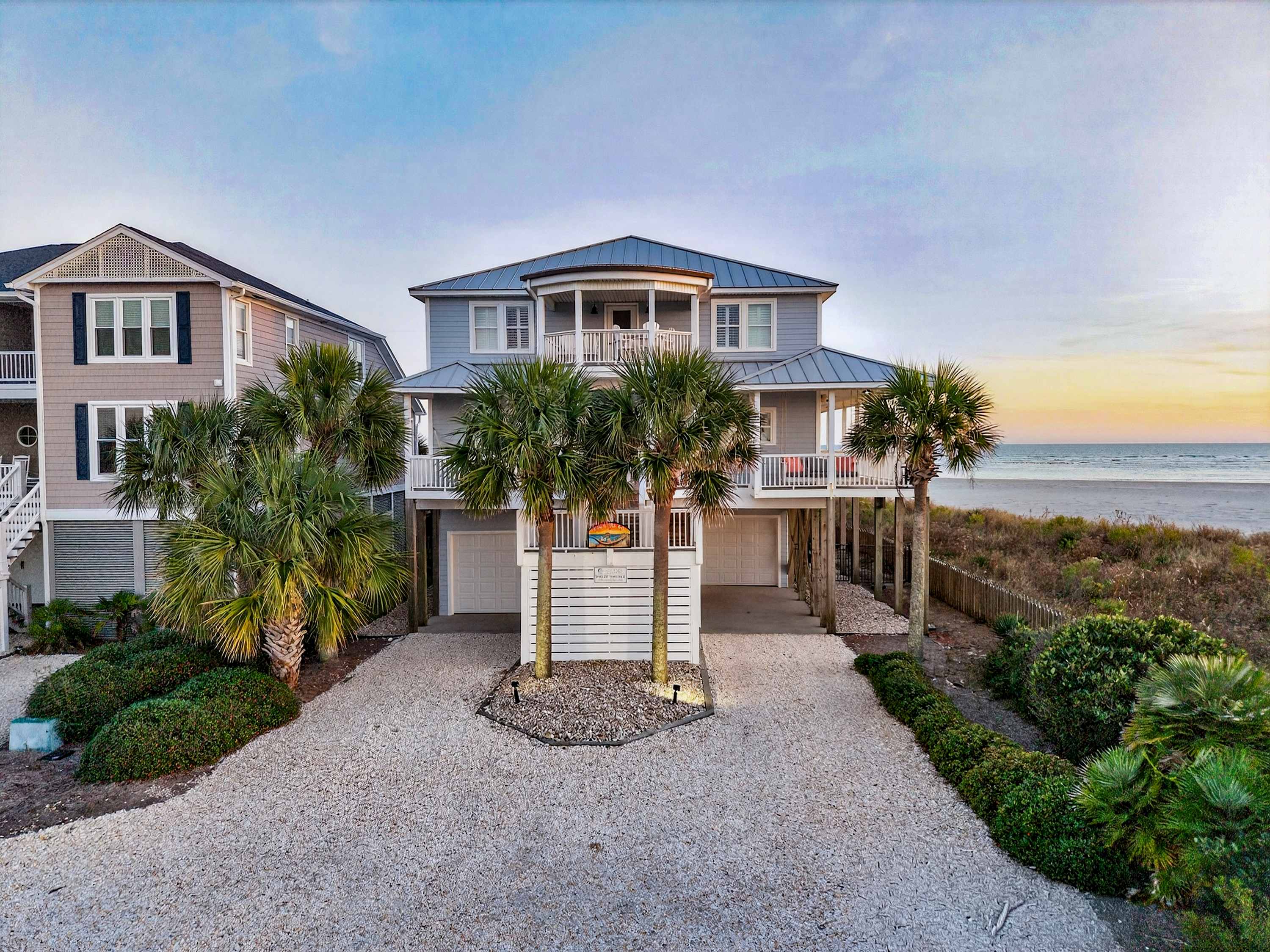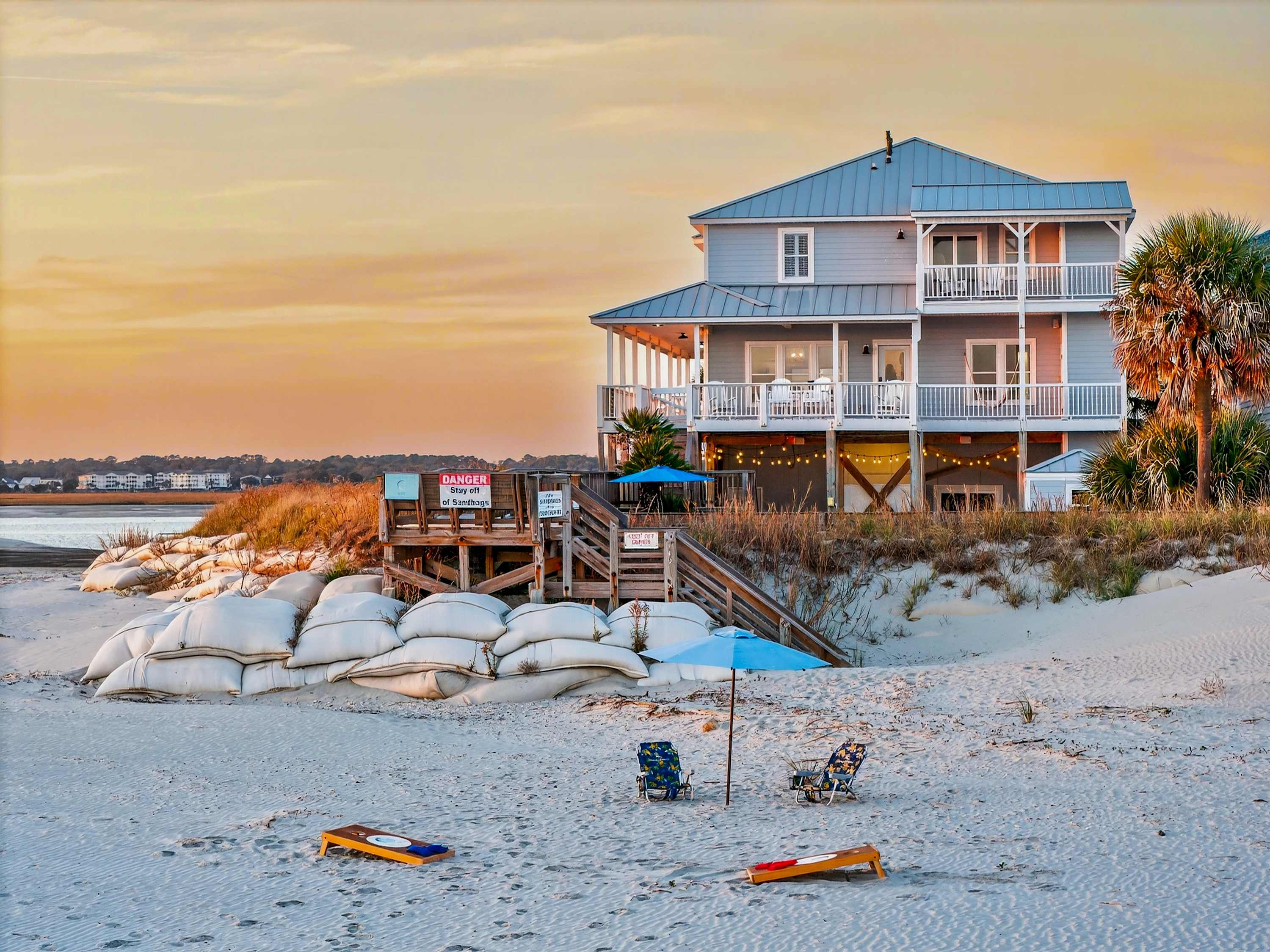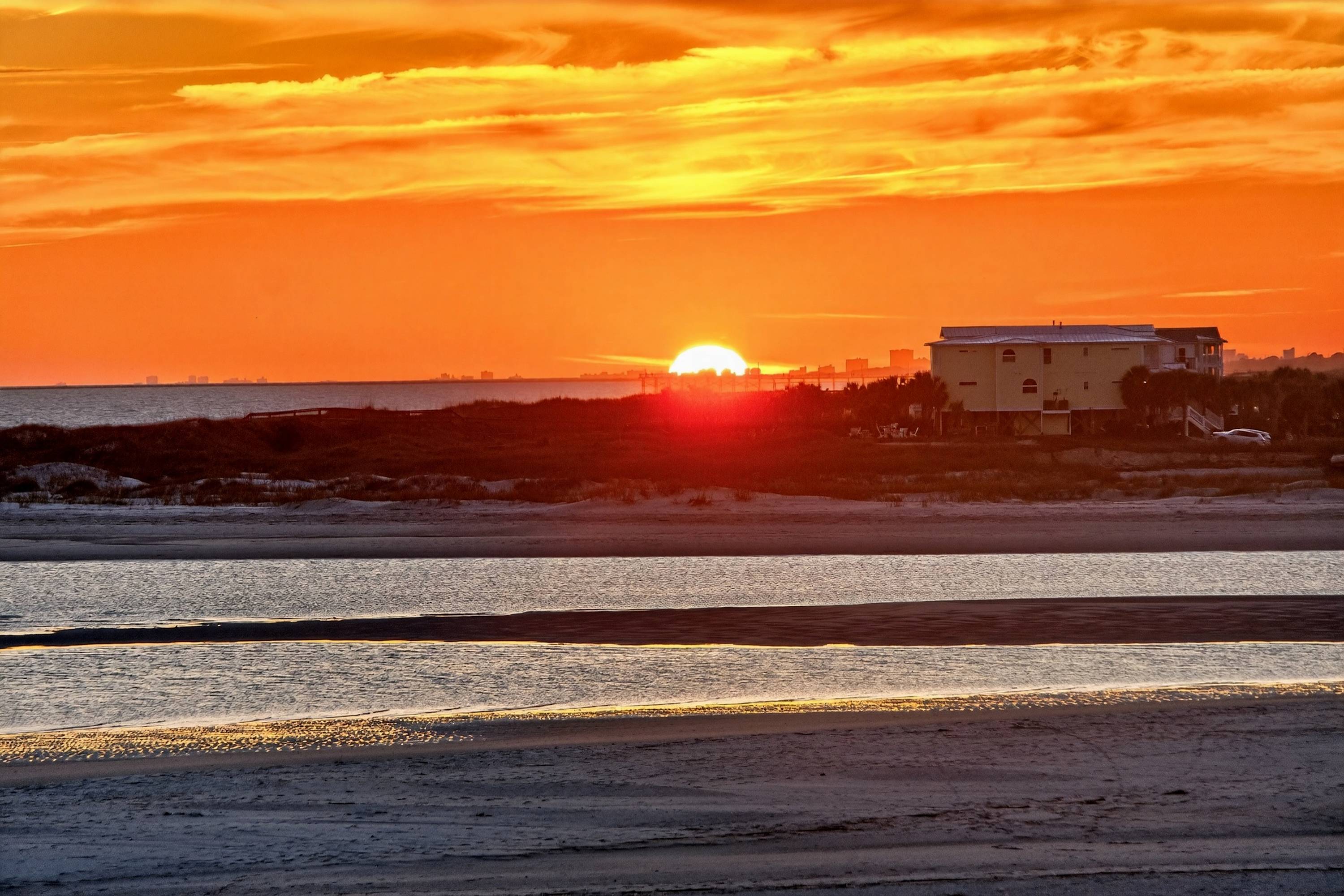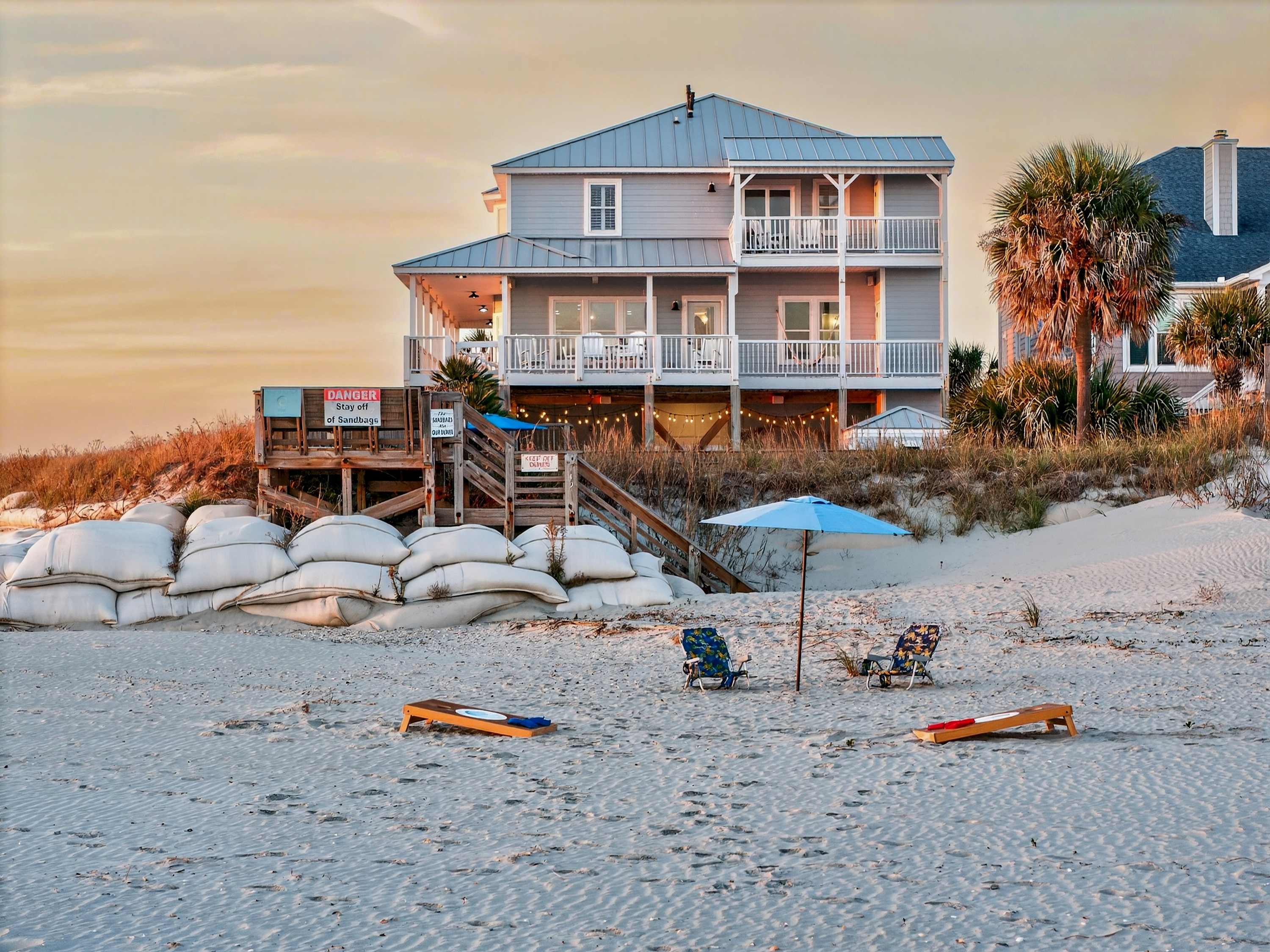 Welcome to End of the Isle with an unforgettable panoramic view! Relaxing covered porches offer spectacular sunset views. Plenty of room for everyone with large bar and dining areas, and an upstairs loft. Private dock with access to the sound on the front side of the house and a beautiful pool in the back. Step right out on to the sand and enjoy one of the most peaceful, private beaches. Located on the gated, private west side of OIB.