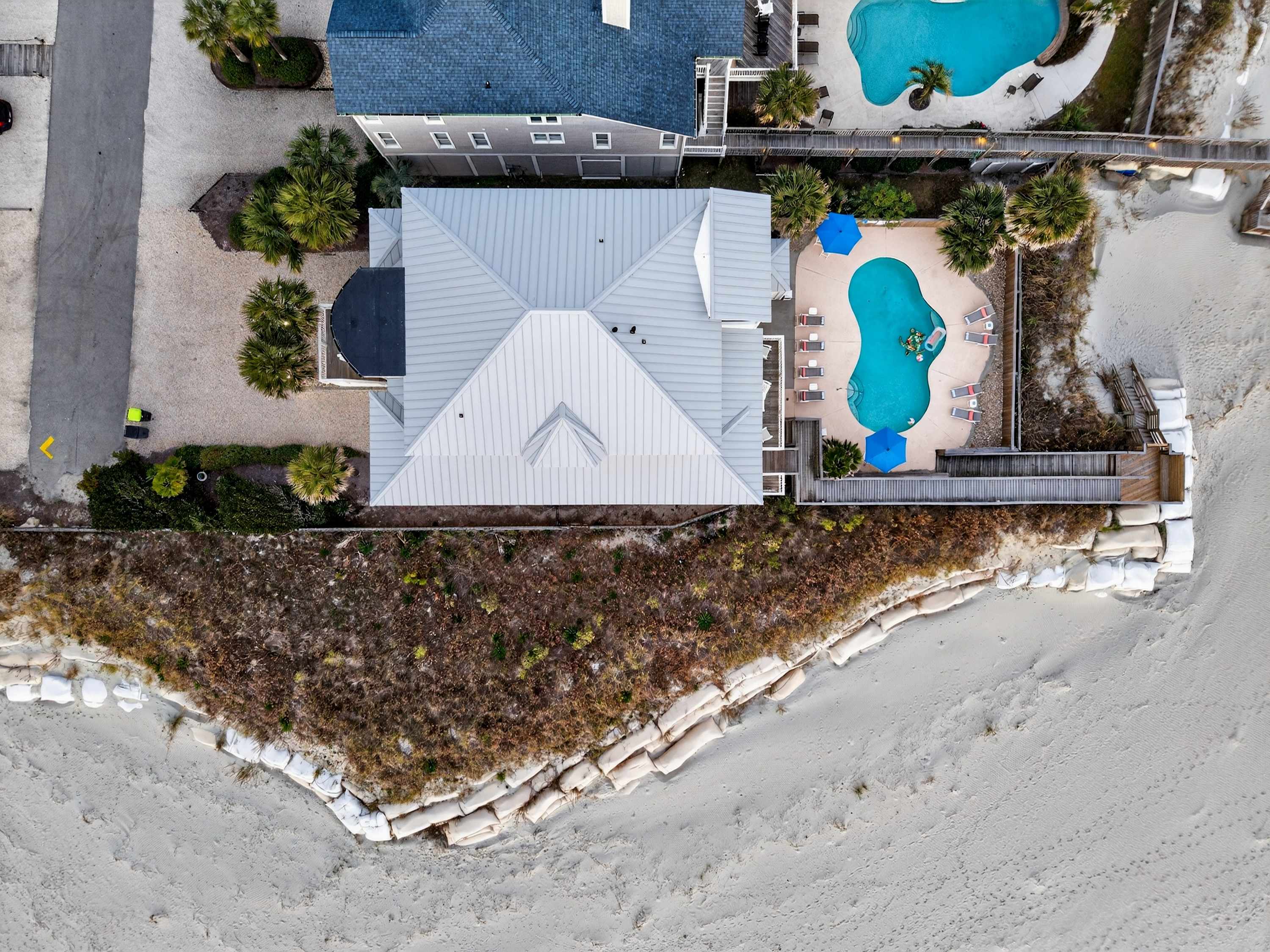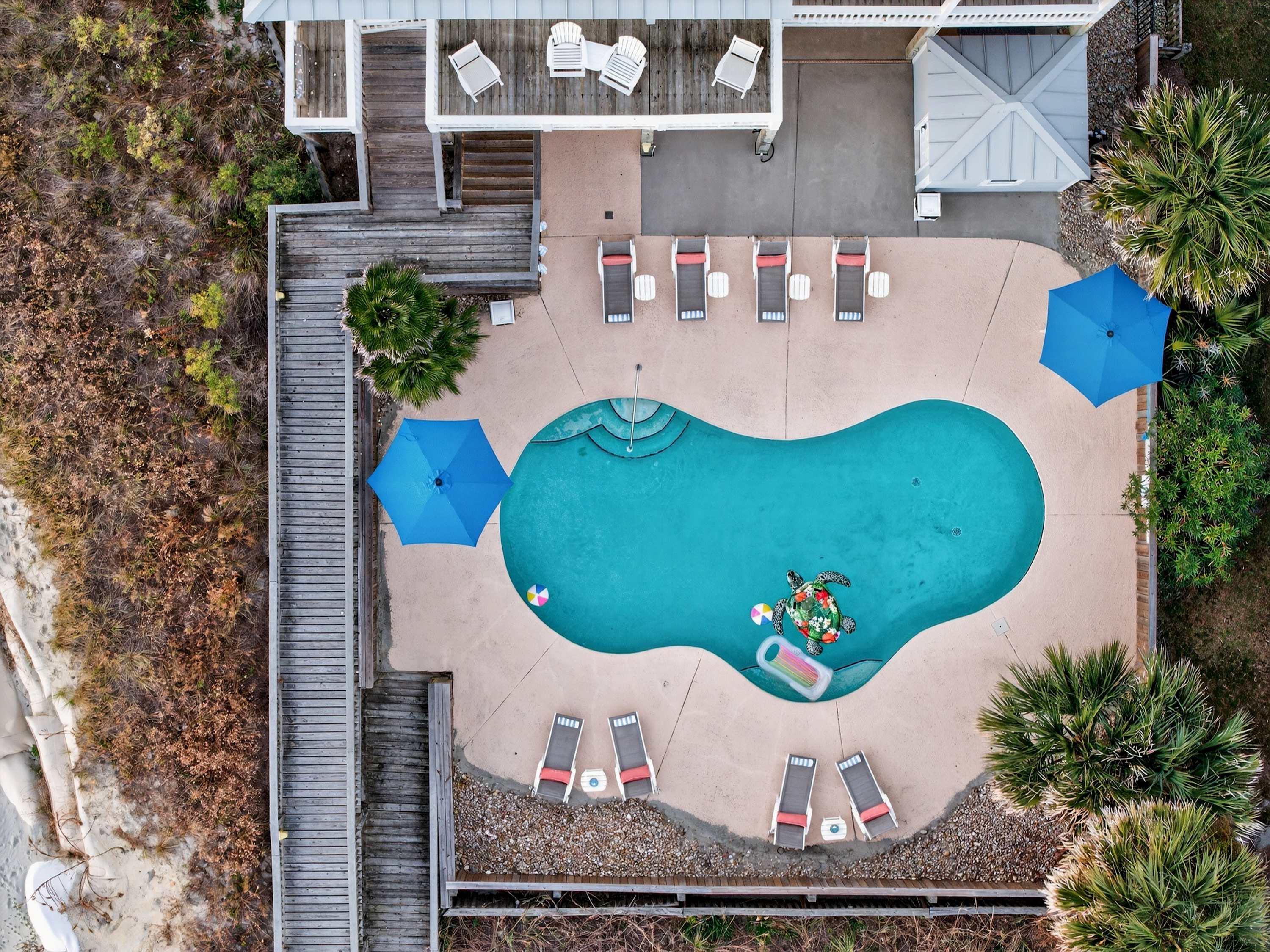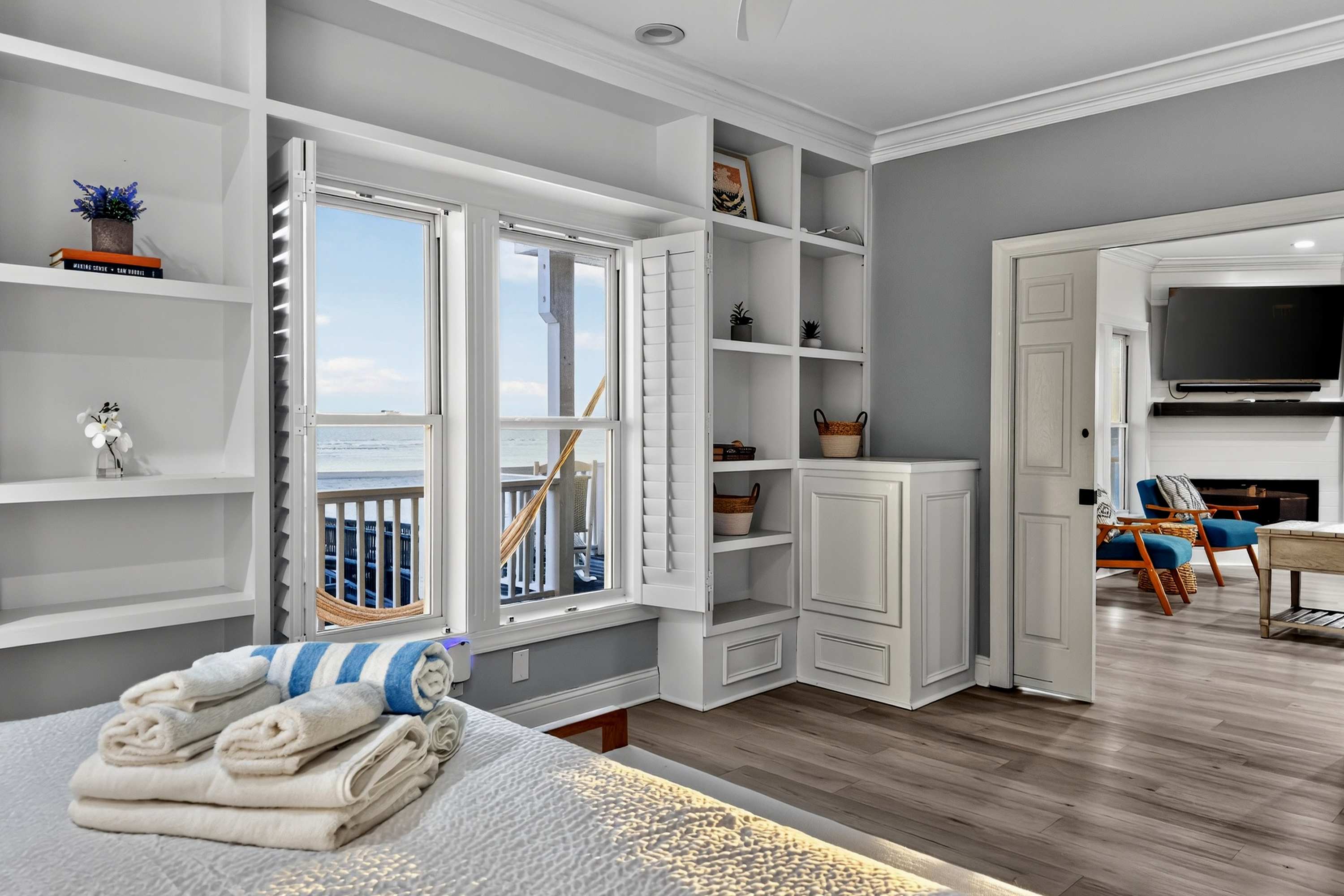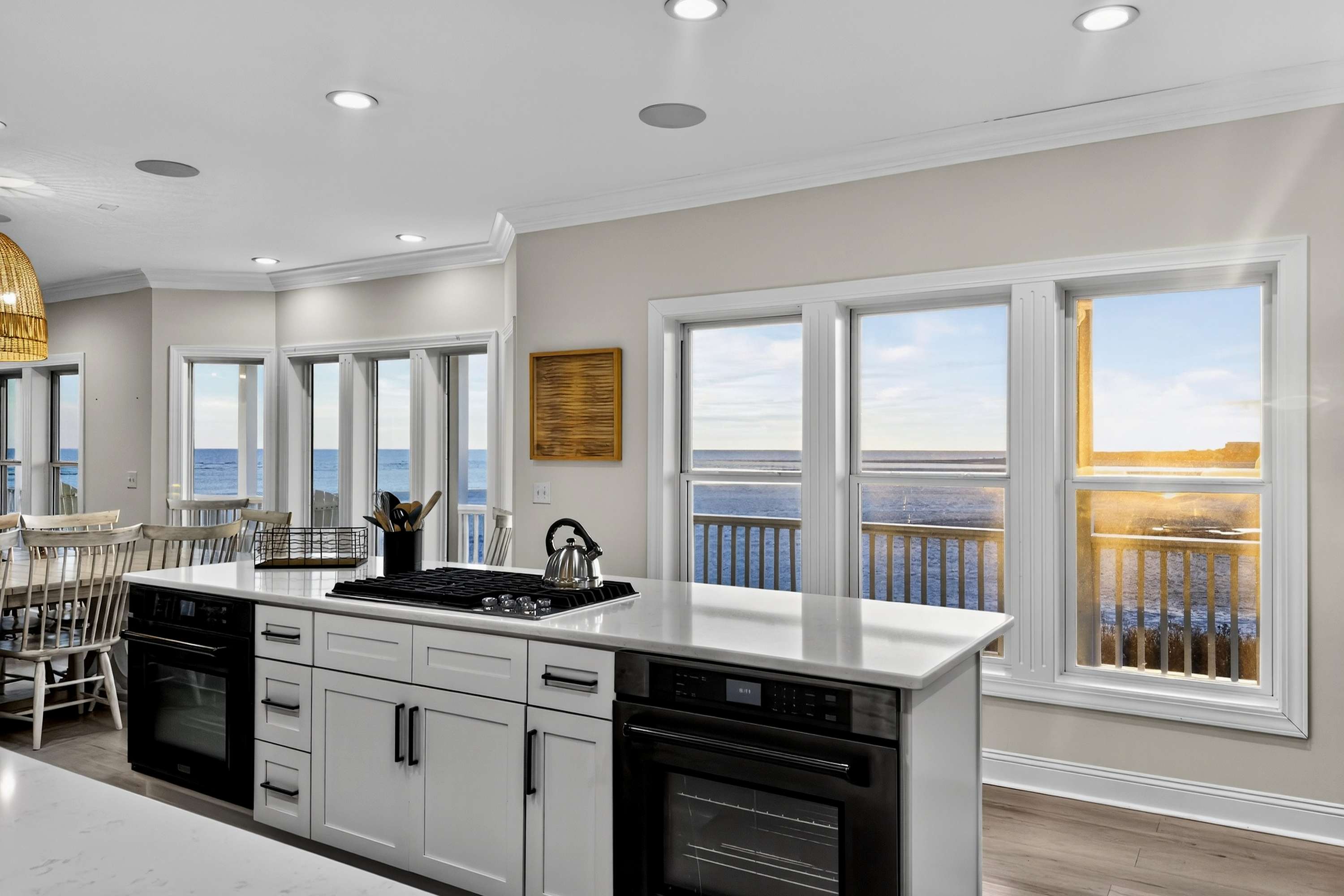Welcome to End of the Isle with an unforgettable panoramic view! Relaxing covered porches offer spectacular sunset views. Plenty of room for everyone with large bar and dining areas, and an upstairs loft. Private dock with access to the sound on the front side of the house and a beautiful pool in the back. Step right out on to the sand and enjoy one of the most peaceful, private beaches. Located on the gated, private west side of OIB.