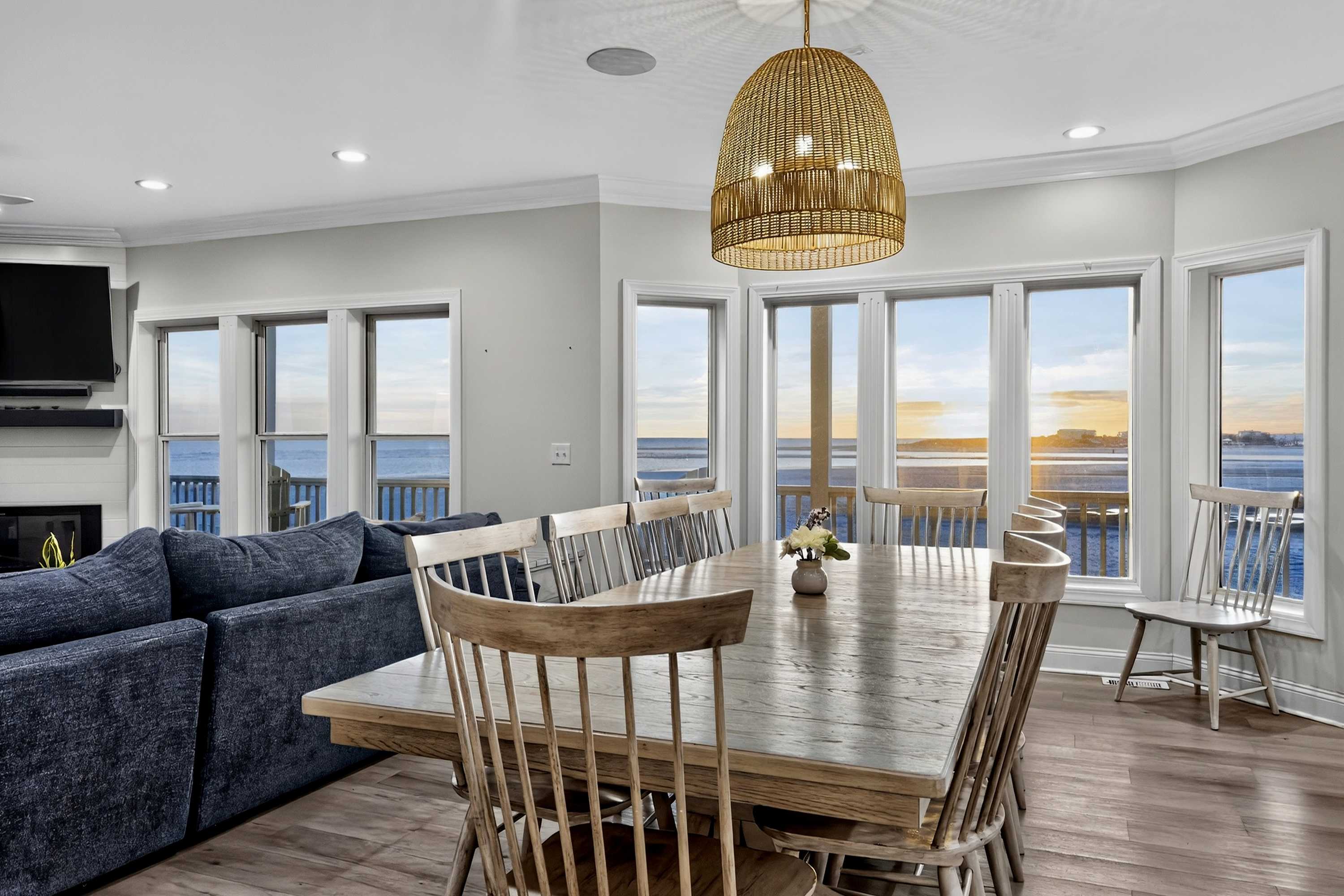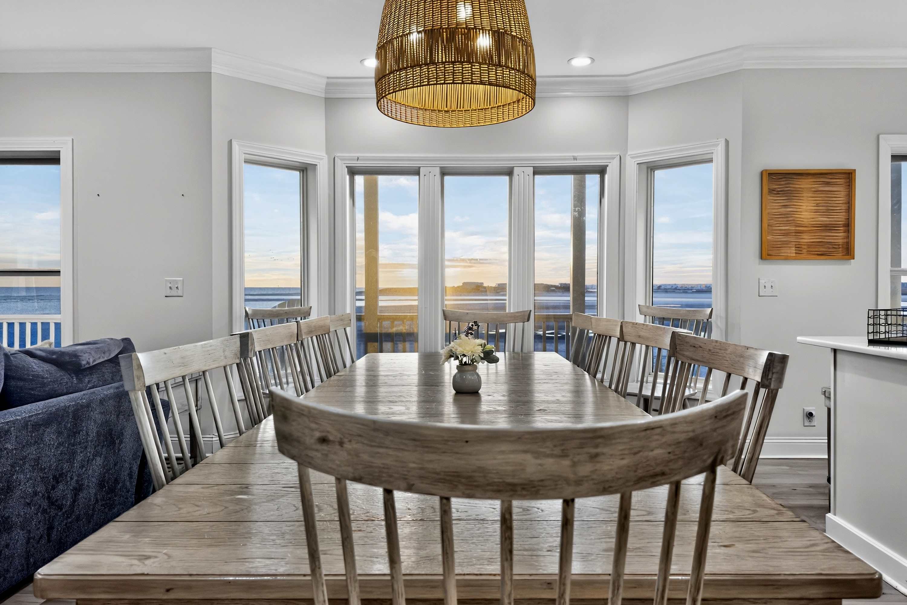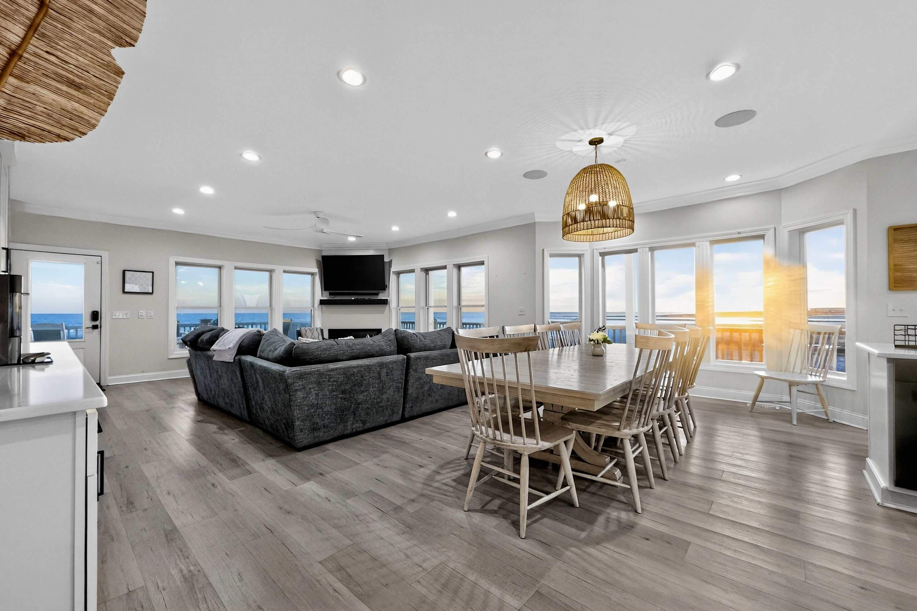 The living room is a perfect space to gather with family and friends. It features a cozy sectional – 8 seater, complemented by two comfortable armchairs. Entertainment options include a Roku TV, providing endless streaming possibilities on Hulu live TV to help you unwind after a long day at the beach. Adjacent to the living area, you’ll find a lovely dining area with a large table seating 12 guests. For a quick breakfast or a casual meal, there’s also a breakfast bar with 12 additional bar stools.